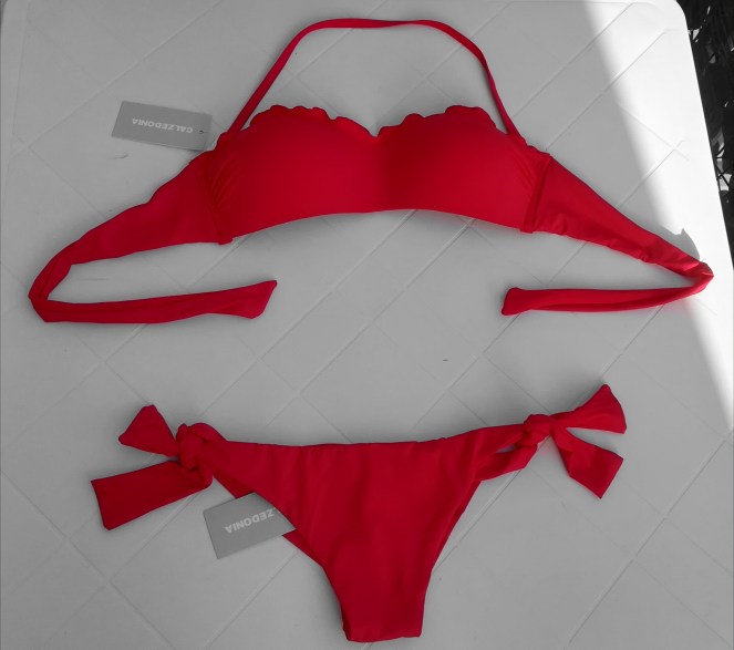 Da Calzedonia invece ho preso un costume rosso sempre a fascia effetto push up (più moderato) con slip brasiliana , ed uno nei colori tropicali gialli e verde che di push non aveva nulla ma mi piaceva la fantasia e l ho comprato lo stesso !!