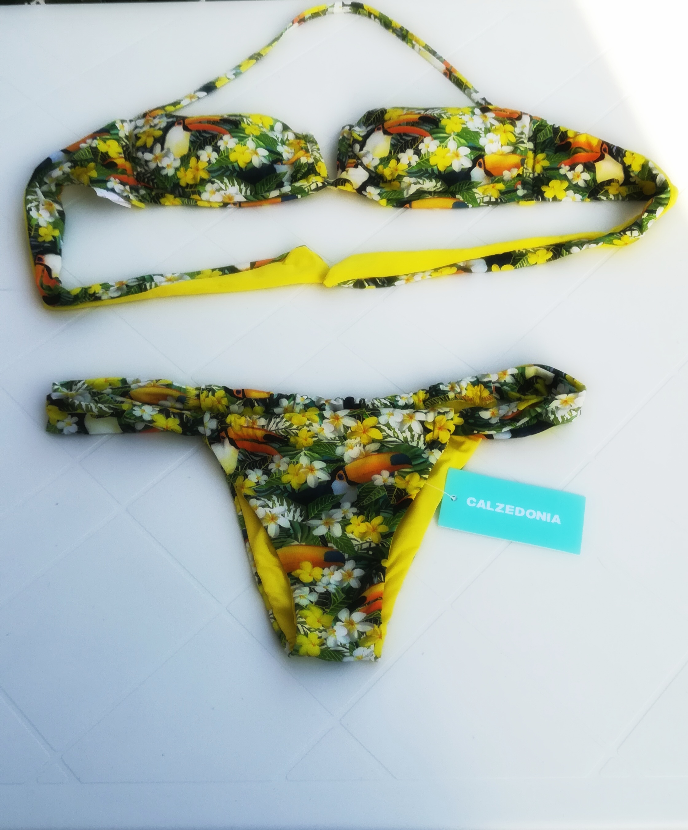 Da Calzedonia invece ho preso un costume rosso sempre a fascia effetto push up (più moderato) con slip brasiliana , ed uno nei colori tropicali gialli e verde che di push non aveva nulla ma mi piaceva la fantasia e l ho comprato lo stesso !!