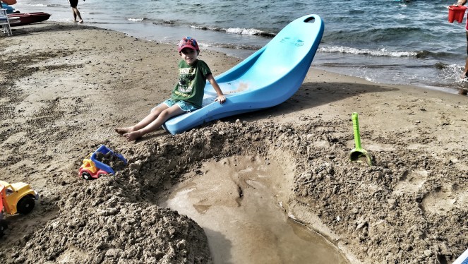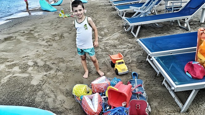 Questa settimana sono stata al mare da sola con mio figlio , pur di intrattenerlo in spiaggia abbiamo fatto mille cose : saltato tra le onde , preso il sole , giocato a racchettoni, fatto castelli di sabbia , avrò scavato più buche io che quelli della Tramvia a Firenze .
