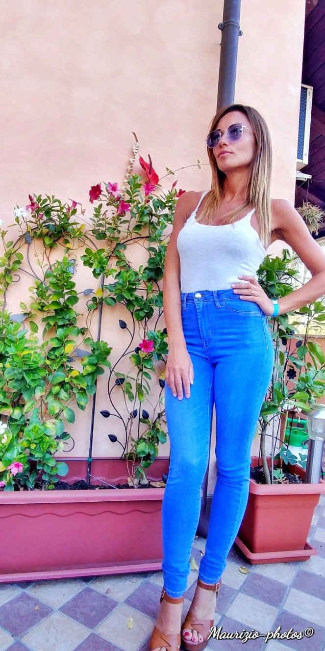 il primo lavaggio blu scuro , lo indosso e subito me ne innamoro , mi fascia come un guanto, slancia la figura persino di una alta solo 1,55 come me , ho completato l’outfit con una canotta grigia ricamata di Terranova .